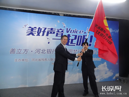 崔江水向河北银行授“河北省助残志愿者使团河北银行分团”旗帜。
