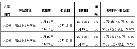 2014年10月14日至10月22日我行新发行以下两款产品,产品发售明细如下: