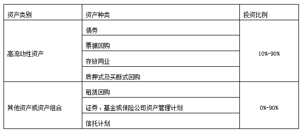 本理财计划资金由河北银行投资于以下符合监管要求的各项资产:一是高流动性金融工具,包括但不限于存放同业、银行间市场质押式回购、票据回购、较高信用等级债券;二是其他资产或资产组合,包括但不限于租赁回购、证券、基金或保险公司资产管理计划、信托计划等。本产品投资的资产种类和比例如下,可在[-10%,+10%]的区间内浮动: