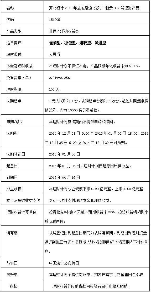 “河北银行2015年益友融通-炫彩•新贵002号理财产品”(代码151009)正式发行,发行期为2014年12月31日 9:00至2015年1月5日18:00。2014年12月26日 9:00至2014年12月30日可预购。本理财计划不保证本金,认购起点为5万元,起息日为2015年1月6日,到期日为2015年4月16日,理财期限100天,认购金额5万(含)以上,理财计划预期到期年化收益率为5.80%。本期产品面向承德、秦皇岛、青岛和天津地区个人理财客户发售。测算收益不等于实际收益,理财非存款、产品有风险、投资须谨慎。