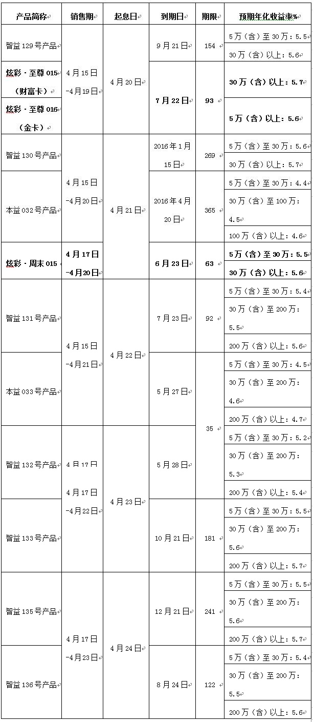 2015年4月15日至2015年4月23日理财产品发售公告