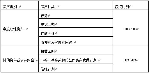本理财计划资金由河北银行投资于以下符合监管要求的各项资产:一是高流动性金融工具,包括但不限于存放同业、银行间市场质押式回购、票据回购、较高信用等级债券;二是其他资产或资产组合,包括但不限于租赁回购、证券、基金或保险公司资产管理计划、信托计划等。本产品投资的资产种类和比例如下,可在[-10%,+10%]的区间内浮动: