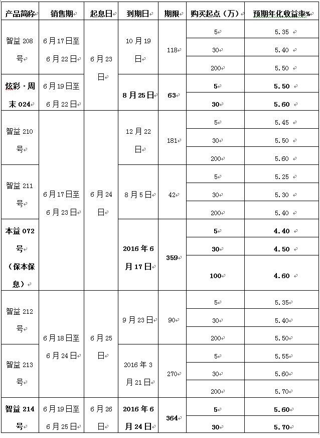 2015年6月17日至2015年6月25日我行将陆续发行八款理财产品,具体发售明细如下: