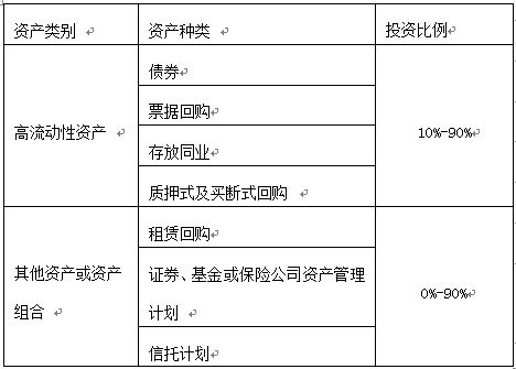 本理财计划本金全部由河北银行投资于以下符合监管要求的各项资产:一是高流动性金融工具,包括但不限于存放同业、银行间市场质押式回购、票据回购、较高信用等级债券;二是其他资产或资产组合,包括但不限于租赁回购、证券、基金或保险公司资产管理计划、信托计划等。本产品投资的资产种类和比例如下,可在[-10%,+10%]的区间内浮动: