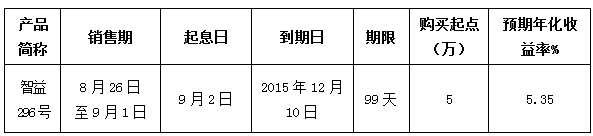 智益296号理财产品(代码151390)将于2015年8月26日08:00发售,认购起点金额为5万元(含),单个客户累计购买上限为50万元(含)整。