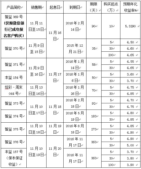 2015年11月9日至2015年11月19日理财产品发售公告