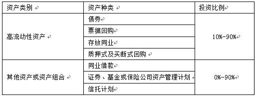 本理财计划资金由河北银行投资于以下符合监管要求的各项资产:一是高流动性金融工具,包括但不限于存放同业、银行间市场质押式回购、票据回购、较高信用等级债券;二是其他资产或资产组合,包括但不限于租赁回购、证券、基金或保险公司资产管理计划、信托计划等。本产品投资的资产种类和比例如下,可在[-10%,+10%]的区间内浮动: