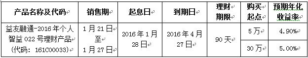 为感谢广大客户对我行理财业务的关注与支持,我行特在青岛地区推出“益友融通-2016年个人智益022号理财产品”,发售产品相关信息如下:
