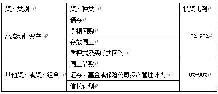本理财计划资金由河北银行投资于以下符合监管要求的各项资产:一是高流动性金融工具,包括但不限于存放同业、银行间市场质押式回购、票据回购、较高信用等级债券;二是其他资产或资产组合,包括但不限于租赁回购、证券、基金或保险公司资产管理计划、信托计划等。本产品投资的资产种类和比例如下,可在[-10%,+10%]的区间内浮动: