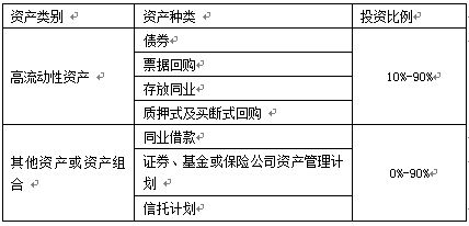 本理财计划资金由河北银行投资于以下符合监管要求的各项资产:一是高流动性金融工具,包括但不限于存放同业、银行间市场质押式回购、票据回购、较高信用等级债券;二是其他资产或资产组合,包括但不限于租赁回购、证券、基金或保险公司资产管理计划、信托计划等。本产品投资的资产种类和比例如下,可在[-10%,+10%]的区间内浮动: