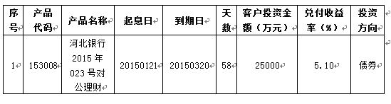 2015年03月20日河北银行2015年023号(153008)对公理财到期。通过资金运作,该期理财产品已顺利实现理财产品说明书中载明的预期年化收益率。现将相关信息公告如下: