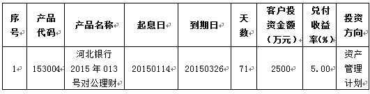 2015年03月26日河北银行2015年013号(153004)对公理财到期。通过资金运作,该期理财产品已顺利实现理财产品说明书中载明的预期年化收益率。现将相关信息公告如下: