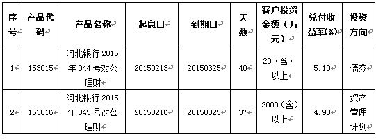 2015年03月25日河北银行2015年044号(153015)、045号(153016)对公理财到期。通过资金运作,2期理财产品已顺利实现理财产品说明书中载明的预期年化收益率。现将相关信息公告如下: