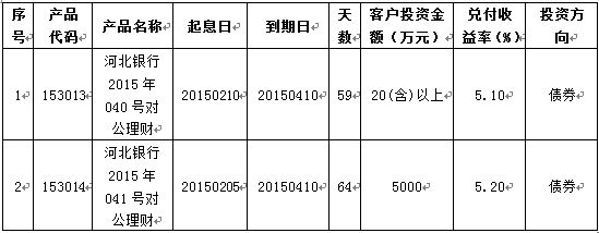 2015年04月10日河北银行2015年040号(153013)、041号(153014)对公理财到期。通过资金运作,2期理财产品已顺利实现理财产品说明书中载明的预期年化收益率。现将相关信息公告如下: