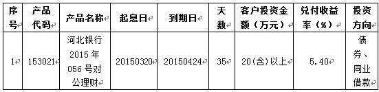 2015年04月24日河北银行2015年056号(153021)对公理财到期。通过资金运作,该期理财产品已顺利实现理财产品说明书中载明的预期年化收益率。现将相关信息公告如下: