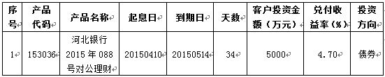 2015年05月14日河北银行2015年088号(153036)对公理财到期。通过资金运作,该期理财产品已顺利实现理财产品说明书中载明的预期年化收益率。现将相关信息公告如下: