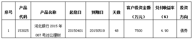 2015年05月19日河北银行2015年067号(153025)对公理财到期。通过资金运作,该期理财产品已顺利实现理财产品说明书中载明的预期年化收益率。现将相关信息公告如下:
