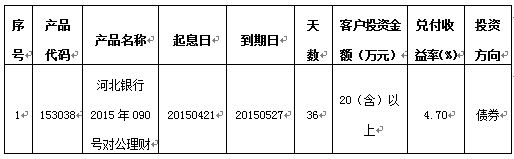 2015年05月27日河北银行2015年090号(153038)对公理财到期。通过资金运作,该期理财产品已顺利实现理财产品说明书中载明的预期年化收益率。现将相关信息公告如下: