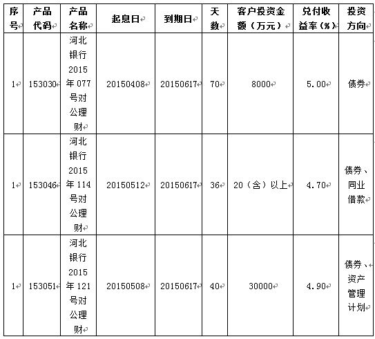 2015年06月17日河北银行2015年077号(153030)、114号(153046)、121号(153051)对公理财到期。通过资金运作,该期理财产品已顺利实现理财产品说明书中载明的预期年化收益率。现将相关信息公告如下: