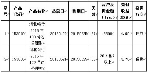 2015年06月25日河北银行2015年100号(153040)、129号(153056)对公理财到期。通过资金运作,该期理财产品已顺利实现理财产品说明书中载明的预期年化收益率。现将相关信息公告如下: