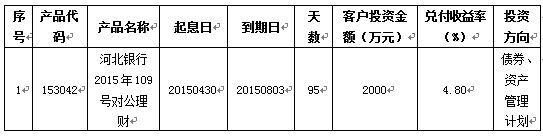 2015年08月03日河北银行2015年109号(153042)对公理财到期。通过资金运作,该期理财产品已顺利实现理财产品说明书中载明的预期年化收益率。现将相关信息公告如下: