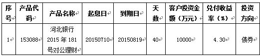 2015年08月19日河北银行2015年181号(153088)对公理财到期。通过资金运作,该期理财产品已顺利实现理财产品说明书中载明的预期年化收益率。现将相关信息公告如下: