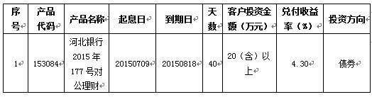 2015年08月18日河北银行2015年177号(153084)对公理财到期。通过资金运作,该期理财产品已顺利实现理财产品说明书中载明的预期年化收益率。现将相关信息公告如下: