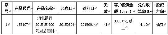 2015年9月14日河北银行2015年200号(153107)对公理财到期。通过资金运作,该期理财产品已顺利实现理财产品说明书中载明的预期年化收益率。现将相关信息公告如下: