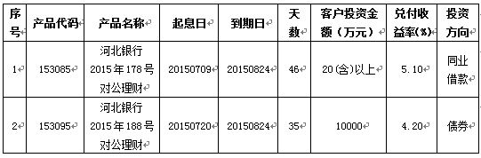 2015年08月24日河北银行2015年178号(153085)、188号(153095)对公理财到期。通过资金运作,该期理财产品已顺利实现理财产品说明书中载明的预期年化收益率。现将相关信息公告如下:
