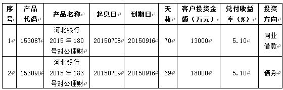 2015年09月16日河北银行2015年180号(153087)、183号(153090)对公理财到期。通过资金运作,该期理财产品已顺利实现理财产品说明书中载明的预期年化收益率。现将相关信息公告如下: