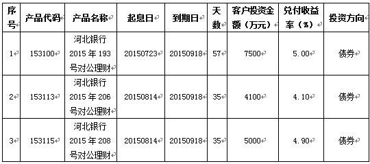 2015年09月18日河北银行2015年193号(153100)、206号(153113)、208号(153115)对公理财到期。通过资金运作,该期理财产品已顺利实现理财产品说明书中载明的预期年化收益率。现将相关信息公告如下: