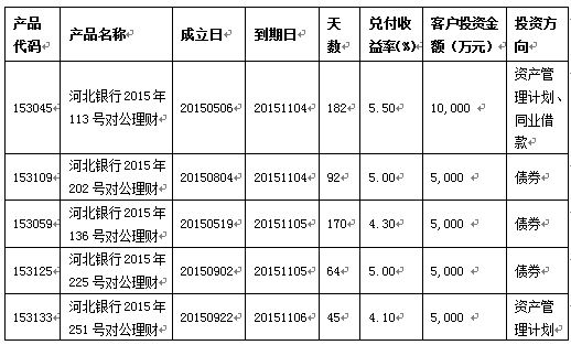 2015年11月04日至2015年11月06日共有五款对公理财到期。通过资金运作,该五款理财产品均已顺利实现理财产品说明书中载明的预期年化收益率。现将相关信息公告如下: