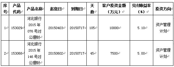 2015年07月17日河北银行2015年076号(153029)、146号(153068)对公理财到期。通过资金运作,该期理财产品已顺利实现理财产品说明书中载明的预期年化收益率。现将相关信息公告如下: