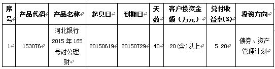 2015年07月29日河北银行2015年165号(153076)对公理财到期。通过资金运作,该期理财产品已顺利实现理财产品说明书中载明的预期年化收益率。现将相关信息公告如下: