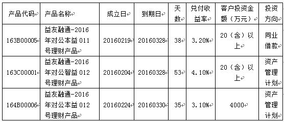 2016年3月28日至2016年3月30日共有三款对公理财到期。通过资金运作,该三款理财产品已顺利实现理财产品说明书中载明的预期年化收益率。现将相关信息公告如下: