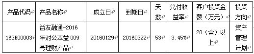 2016年3月22日共有一款对公理财到期。通过资金运作,该款理财产品已顺利实现理财产品说明书中载明的预期年化收益率。现将相关信息公告如下: