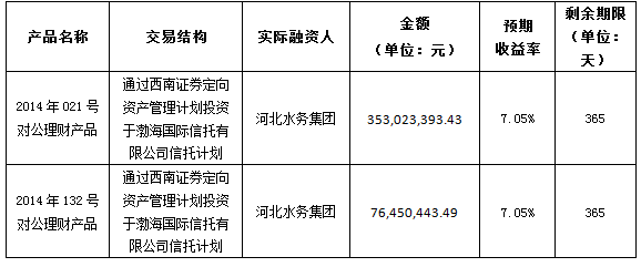 我行发行的2014年021号对公理财产品及2014年132号对公理财产品投资运作情况良好,2014年9月29日为以上产品配置如下非标准化债权资产: