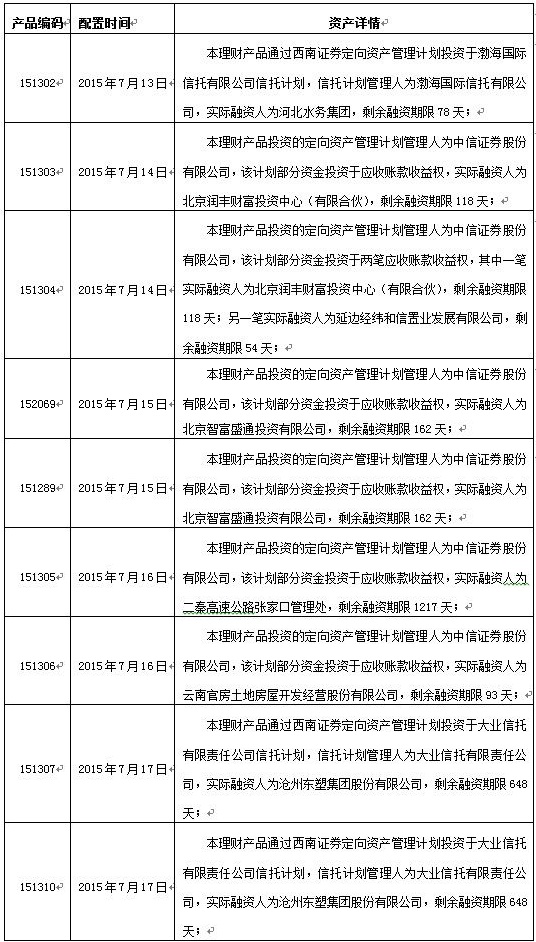 2015年7月13日至2015年7月17日我中心为以下理财产品配置非标资产,详情如下: