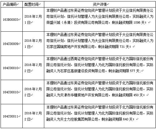 我行于2016年2月1日至2月2日为以下理财产品配置非标资产,详情如下: