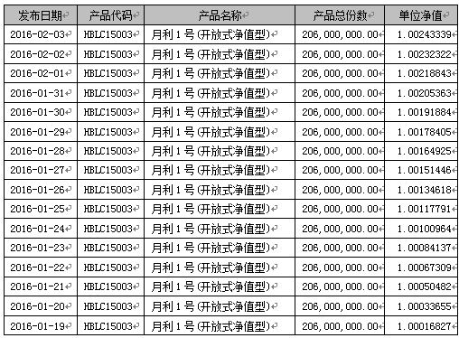 我行发行的“河北银行月利1号开放式净值型理财产品”(以下简称月利1号)将于2016年2月10日至16日开放,在此期间接受对公客户申购、赎回申请。2月16日为“月利1号”2月份开放日、分红日。现将产品2016年1月19日至2016年2月3日净值情况公告如下: