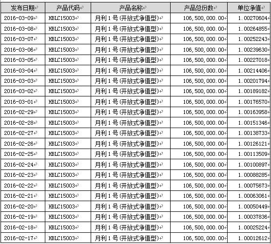我行发行的“河北银行月利1号开放式净值型理财产品”(以下简称月利1号)将于2016年3月10日至16日开放,在此期间接受对公客户申购、赎回申请。3月16日为“月利1号”3月份开放日、分红日。现将产品2016年2月17日至2016年3月9日净值情况公告如下:
