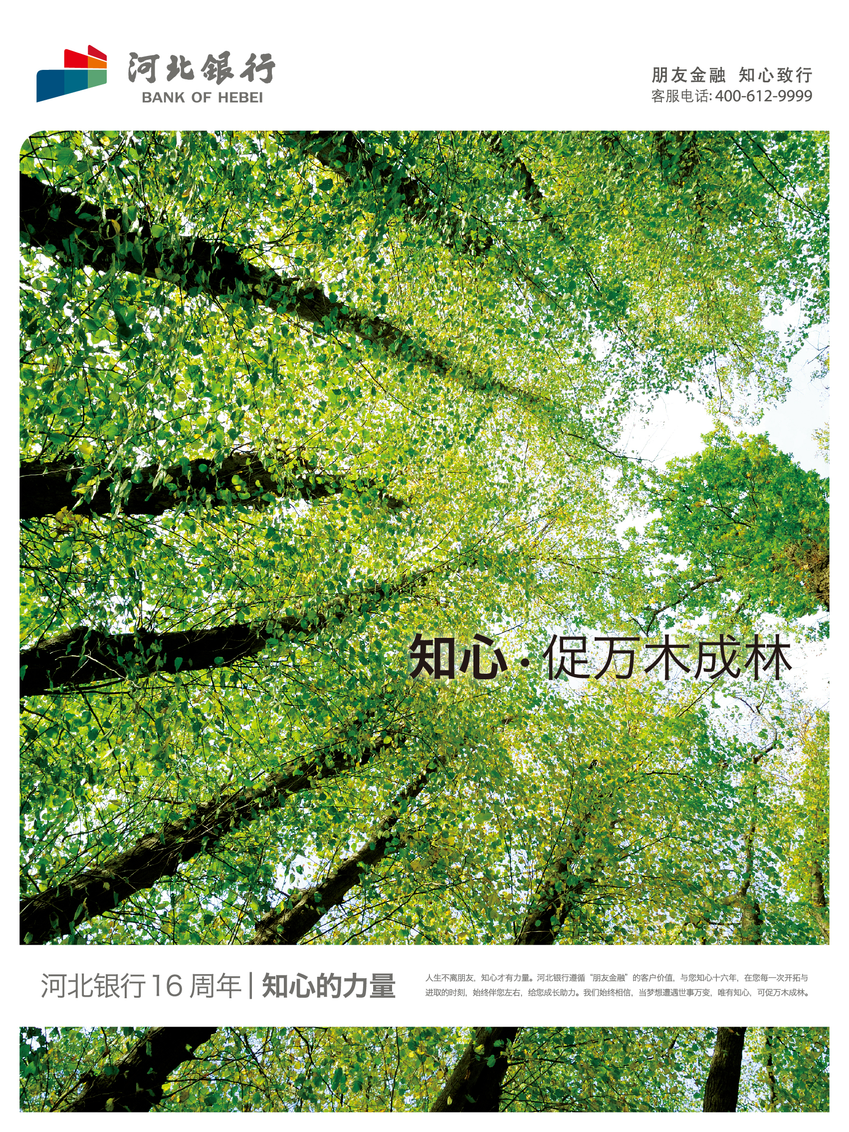 人生不离朋友,知心才有力量。河北银行遵循“朋友金融”的客户价值理念,与您知心十六年,在您每一次开拓与进取的时刻,始终伴您左右,给您成长助力。我们始终相信,当梦想遭遇世事万变,唯有知心,可促万木成林。