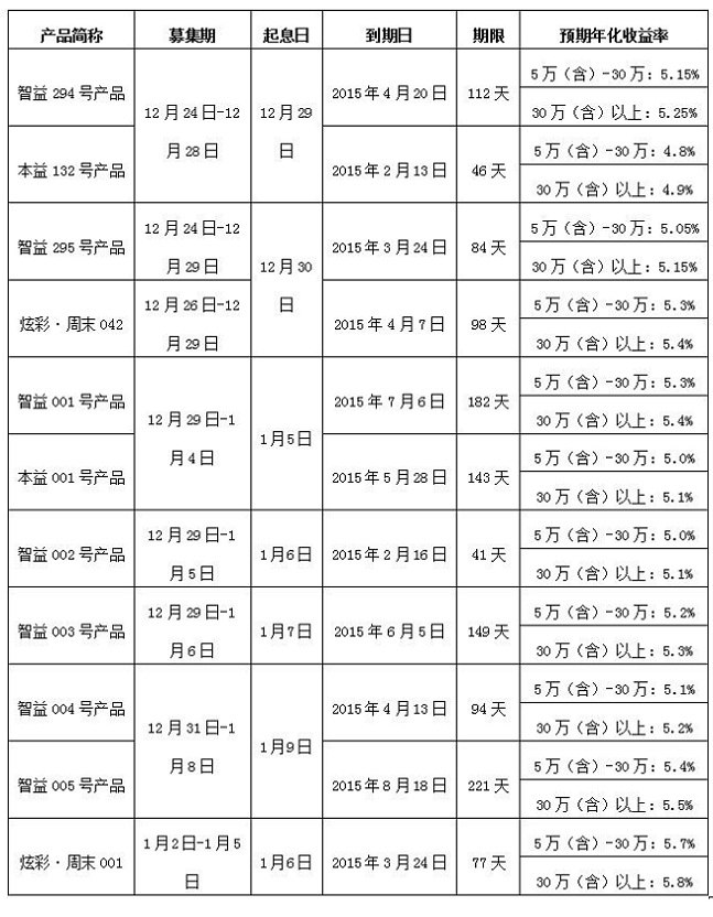 2014年12月24日至2015年1月8日我行将陆续发行九款非保本浮动收益类理财产品:智益294号产品(代码141371),智益295号产品(代码141373),炫彩•周末042号产品(代码141374),智益001号产品(代码151001),智益002号产品(代码151003),智益003号产品(代码151005),智益004号产品(代码151006),智益005号产品(代码151007),炫彩•周末001号产品(代码151004)和两款保本浮动收益类理财产品:本益132号产品(代码141372),本益001号产品(代码151002)。十一款理财产品发售明细如下: