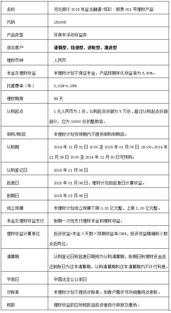 “河北银行2015年益友融通-炫彩•新贵001号理财产品”(代码151008)正式发行,发行期为2014年12月31日 9:00至2015年1月5日18:00。2014年12月26日 9:00至2014年12月30日可预购。本理财计划不保证本金,认购起点为5万元,起息日为2015年1月6日,到期日为2015年3月6日,理财期限59天,认购金额5万(含)以上,理财计划预期到期年化收益率为5.50%。本期产品面向2014年11月25日至12月24日在我行核心系统新开客户号的客户发售。测算收益不等于实际收益,理财非存款、产品有风险、投资须谨慎。