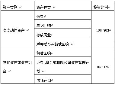 本理财计划资金由河北银行投资于以下符合监管要求的各项资产:一是高流动性金融工具,包括但不限于存放同业、银行间市场质押式回购、票据回购、较高信用等级债券;二是其他资产或资产组合,包括但不限于租赁回购、证券、基金或保险公司资产管理计划、信托计划等。本产品投资的资产种类和比例如下,可在[-10%,+10%]的区间内浮动: