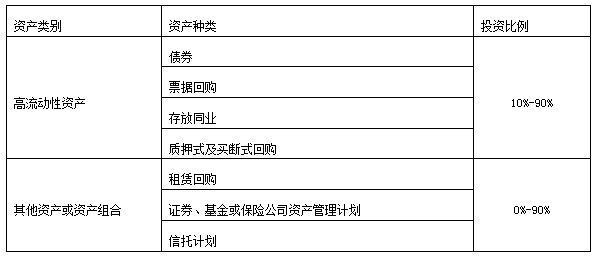 本理财计划资金由河北银行投资于以下符合监管要求的各项资产:一是高流动性金融工具,包括但不限于存放同业、银行间市场质押式回购、票据回购、较高信用等级债券;二是其他资产或资产组合,包括但不限于租赁回购、证券、基金或保险公司资产管理计划、信托计划等。本产品投资的资产种类和比例如下,可在[-10%,+10%]的区间内浮动: