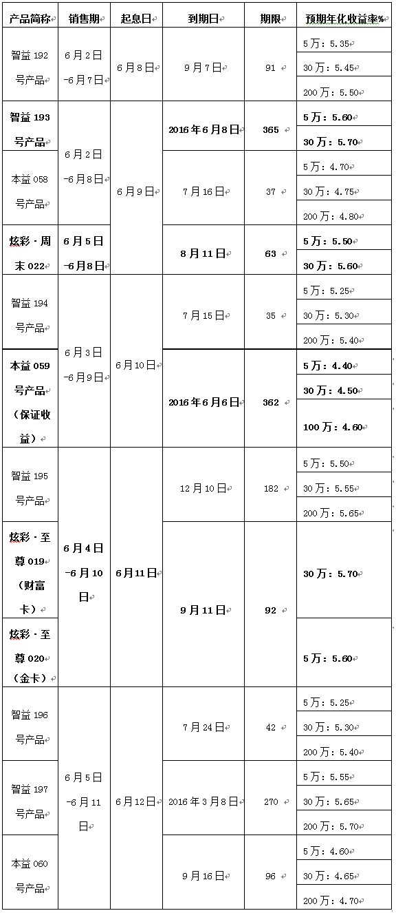 2015年6月2日至2015年6月11日我行将陆续发行十二款理财产品,具体发售明细如下: