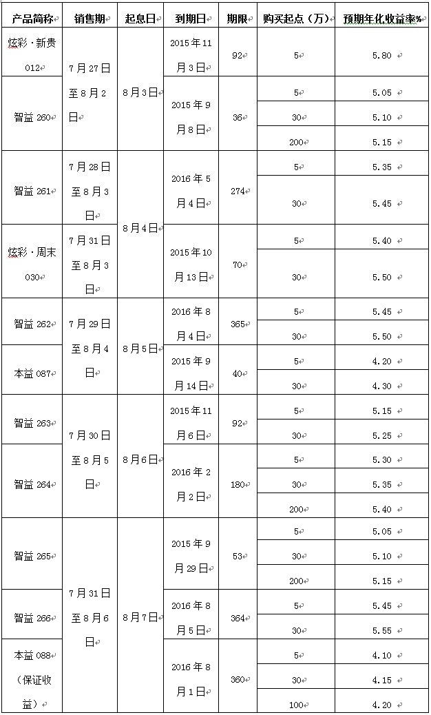 2015年7月27日至2015年8月6日理财产品发售公告