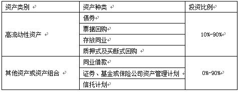 本理财计划资金由河北银行投资于以下符合监管要求的各项资产:一是高流动性金融工具,包括但不限于存放同业、银行间市场质押式回购、票据回购、较高信用等级债券;二是其他资产或资产组合,包括但不限于租赁回购、证券、基金或保险公司资产管理计划、信托计划等。本产品投资的资产种类和比例如下,可在[-10%,+10%]的区间内浮动: