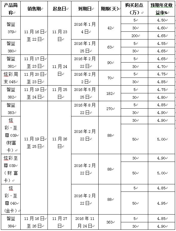 2015年11月16日至2015年11月26日我行将陆续发行九款理财产品,具体发售明细如下:
